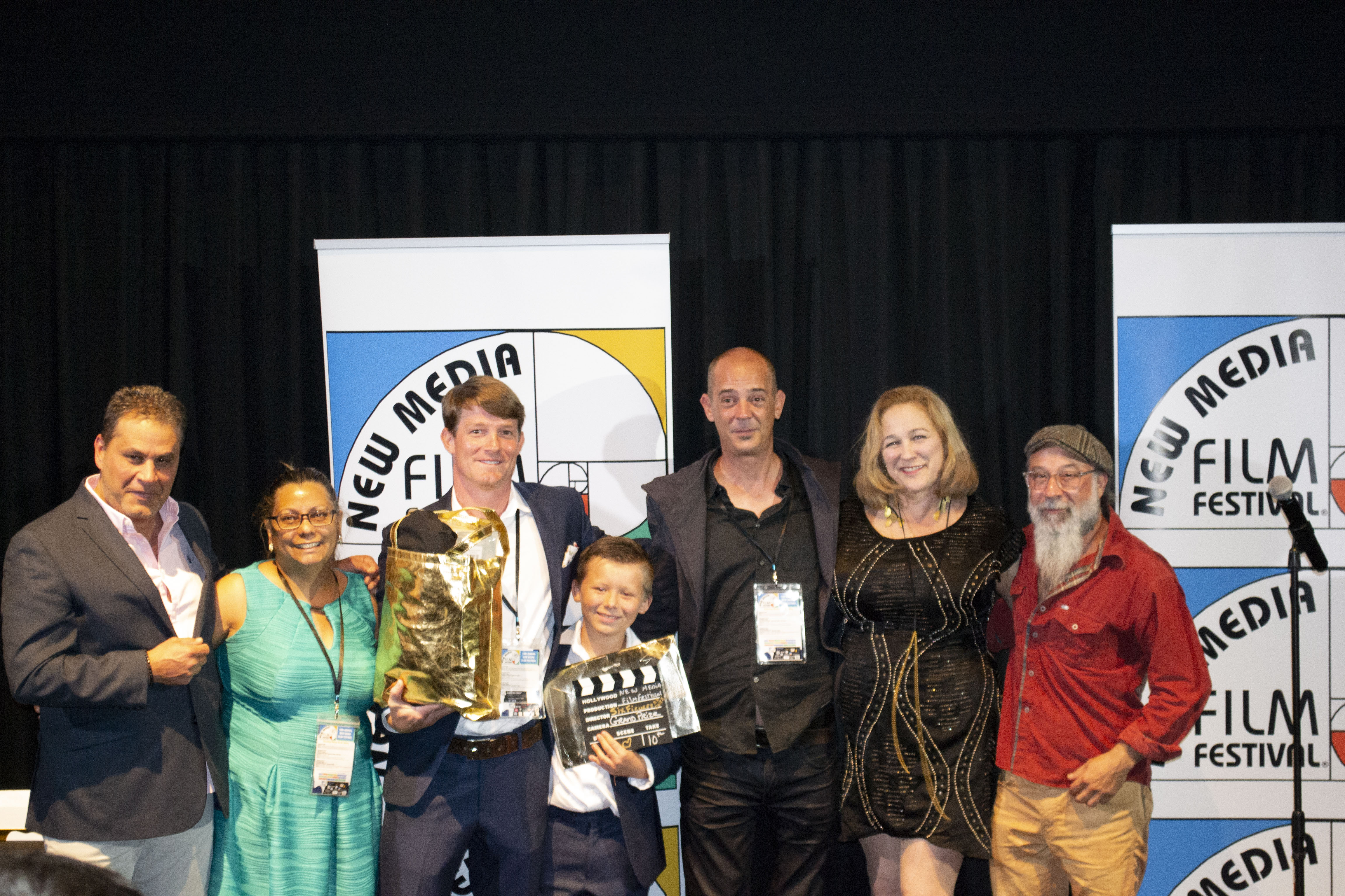 Photo Credit, Fabian. L to R, Sponsors Rich Mongo & Antonia Roman, Winners Aaron Wright & Son, Catalyst Philip Hovrath, Founder/Director Susan Johnston, Grammy Winning Record Producer Barry Goldberg (Fleetwood Mac – The Dance)